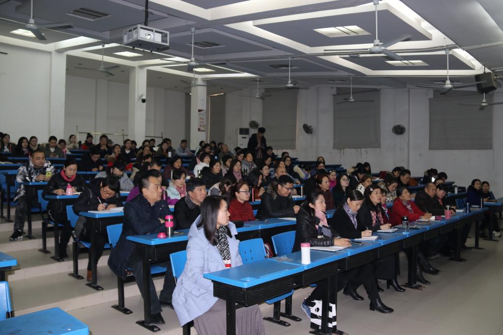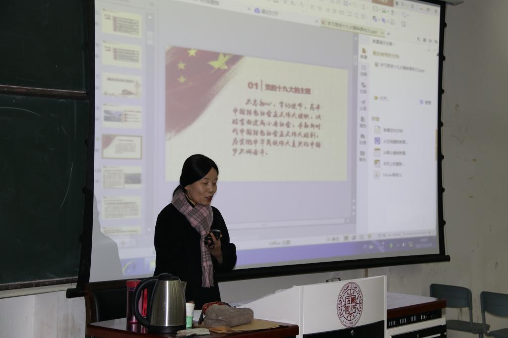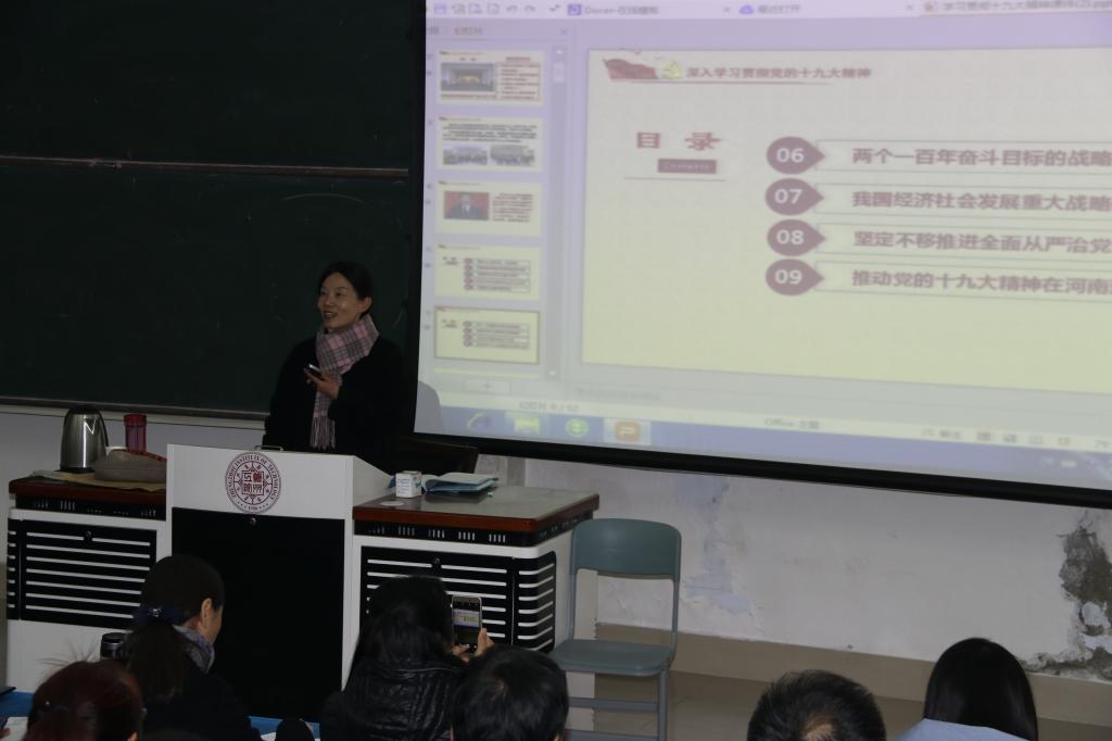 为深入学习宣传贯彻党的十九大精神,按照学校党委的安排,12月29日下午,图书馆、外国语学院、离退休处、继续教育学院、德育教学部、艺术设计学院、国际教育学院七部门联合在英才校区6号教学楼举行党的“十九大”精神宣讲会。学校机关党总支张阳书记受邀做宣讲。